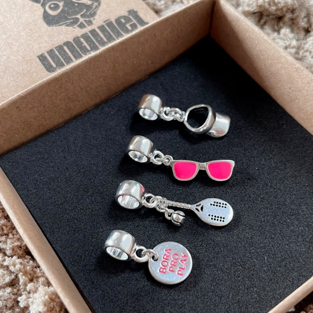 Total de 4 peças:  1 berloque duplo Raquete com bolinha + 1 berloque Viseira + 1 berloque óculos de sol Pink + 1 berloque Bora pro Play Pink
