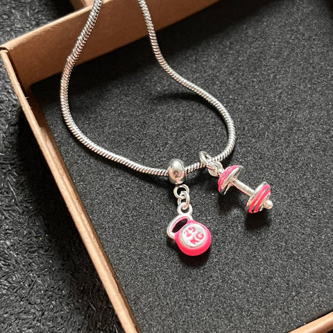 Pulseira estilo fecho gravata, regulável com pingente Barra Pink + pingente Kettlebell 25kg Pink. Peças e pingentes banhados em prata 950 com 50 milésimos de camada. Cor pink aplicada em resina.