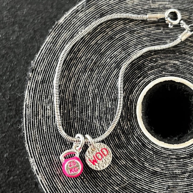 Pulseira corrente rabo de rato 1.9mm, tamanho padrão feminino 18cm, com Kettlebell 25kg pink + WOD Pink. Peça banhada a prata 950. Cor aplicada em resina.